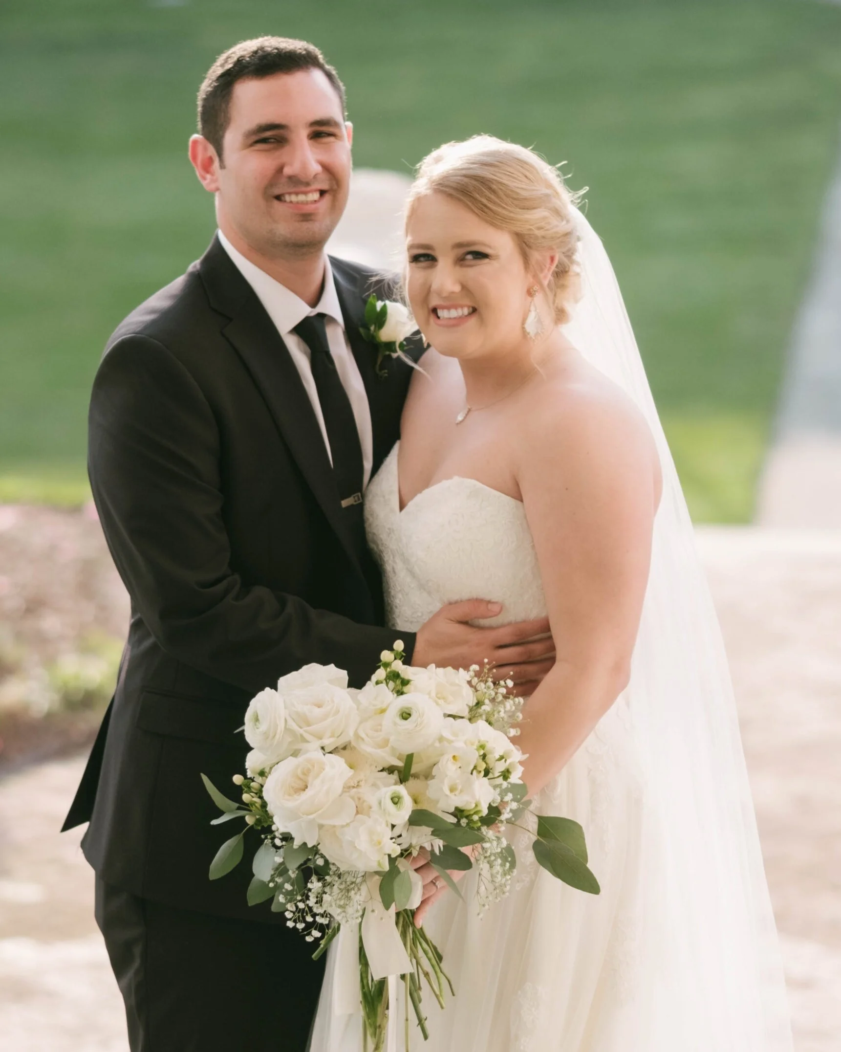 Kate’s classic updo and natural makeup paired perfectly with her lovely gown and gorgeous cathedral length veil from Blush Bridal. She accessorized with jewelry from Kendra Scott, a stunning engagement ring from Anton’s Jeweler and a special ring from her grandmother. Juan complemented this timeless look well with his traditional black suit from Macy’s.